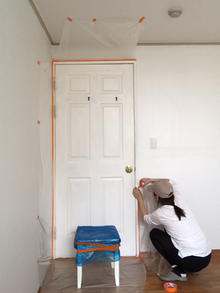 바닥에는 커버링 테이프를 여러장 깔고 마스킹테이프로 잘 고정해주세요. 신발을 신고 움직이면 비닐이 쉽게 찣어지거든요. 방 바깥쪽과 안쪽을 연결되게 통짜로 깔고 마스킹테이프로 탄탄하게 고정해주시는 게 좋아요. 저처럼 바깥쪽 안쪽 나눠서 하면 고정이 약해요.
